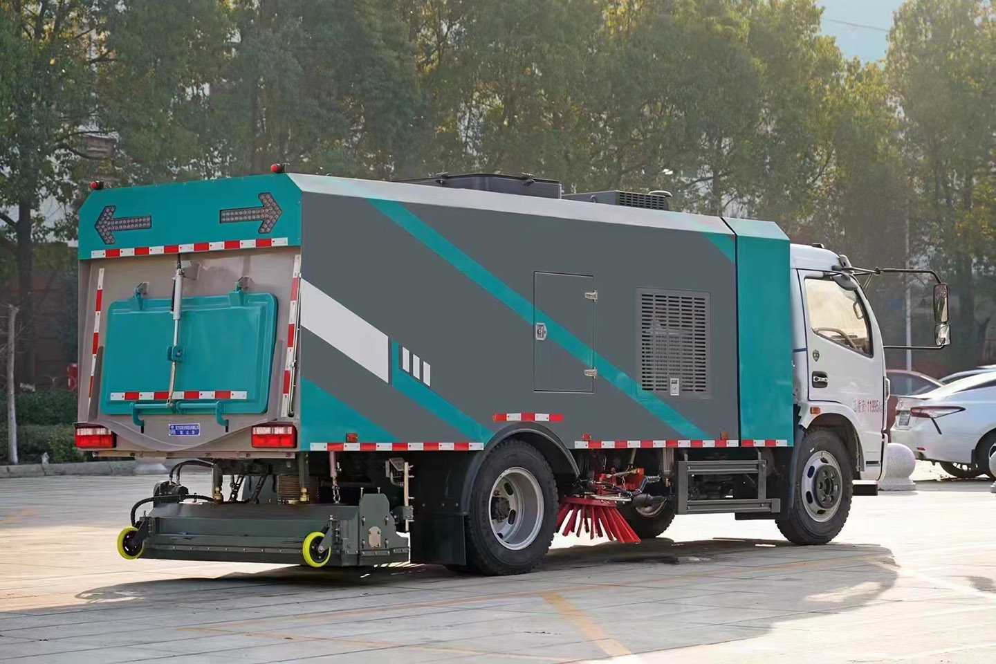 Upper structure configuration: Cummins 140hp auxiliary engine; Schneider control switches; GTM high-pressure water pump; Haipruis solenoid valve assembly; continuously variable automatic clutch; maintenance-free centrifugal fan; 8 dust filter canisters; imported pulse valves; manual pump emergency system; tail spray; tail LED arrow lights; vertical filter cartridge structure; two front sweeping brushes; 2.5-meter wide suction cup; rear roller sweeping suction cup; built-in high-pressure spray bar. Water tank capacity: 2 cubic meters; stainless steel garbage bin capacity: 5 cubic meters.
